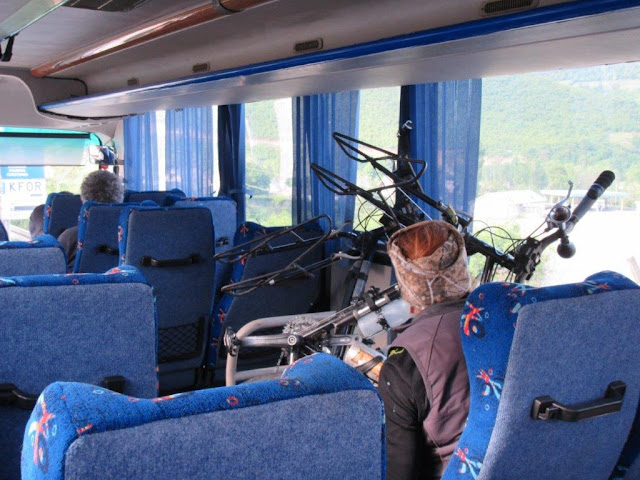 6 a.m. Sure enough, a new bus which has driven all the way for us stops to collect us. It’s very small though so we have to put the bikes inside on one of the seats as they don't fit underneath...